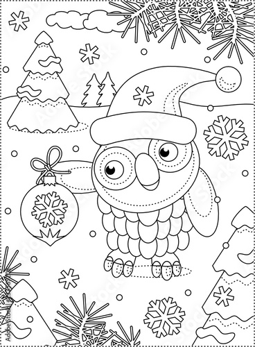 From the gallery. Coloring pages for children. Christmas owl on moon color this cartoon owl with glasses and santa claus hat sitting on a half moon with beautiful winter clouds and stars. Just color kids.